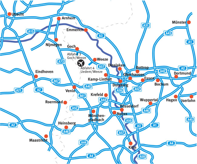 dan op de B9 richting Kleve/Weeze, daarna het aangegeven luchthavensymbool volgen.